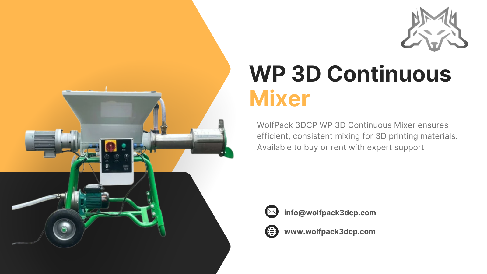 The WP 3D Continuous Mixer from WolfPack 3DCP is designed for professionals who require consistent, high-quality material mixing for 3D printing, construction, and industrial applications. Efficient mixing is crucial for producing durable, high-precision prints, and the WP 3D Continuous Mixer delivers uniform material flow for clay, concrete, and composite materials.